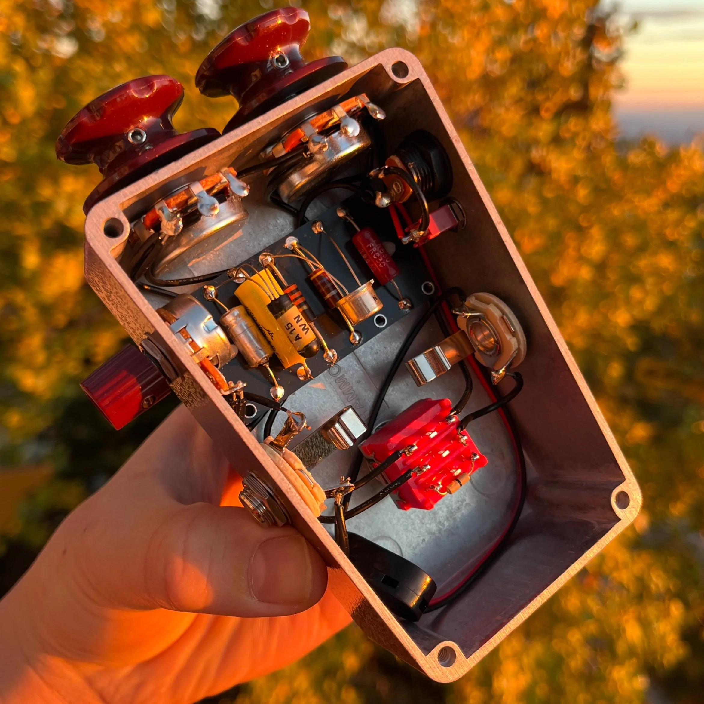 My take on the early germanium Fuzz Face / MK1.5 circuits built in England circa 1965. This model borrows elements from both circuit variants for a more refined “clean up” and wider bias range. The circuit is responsive to different guitar and pickup combinations and provides a gradual and articulate clean-up when rolling back the guitar volume. An external bias control modifies the character of the fuzz for a gated / saxophone-like fuzz tone at the clockwise extreme, an articulate clean-up in the counter clockwise extreme, and a range of classic 60’s fuzz tones in the middle range of the knob.